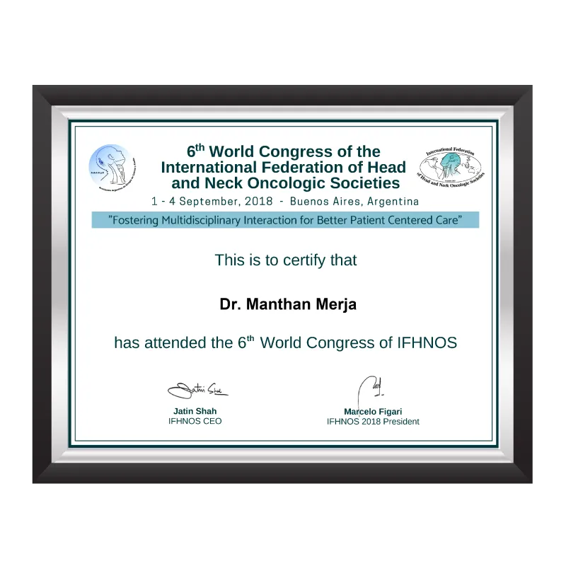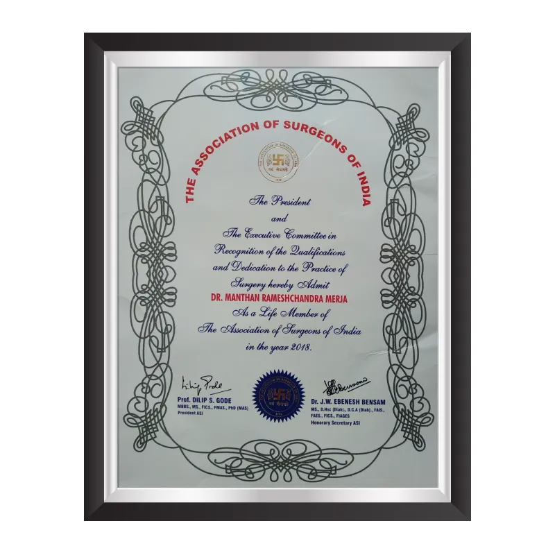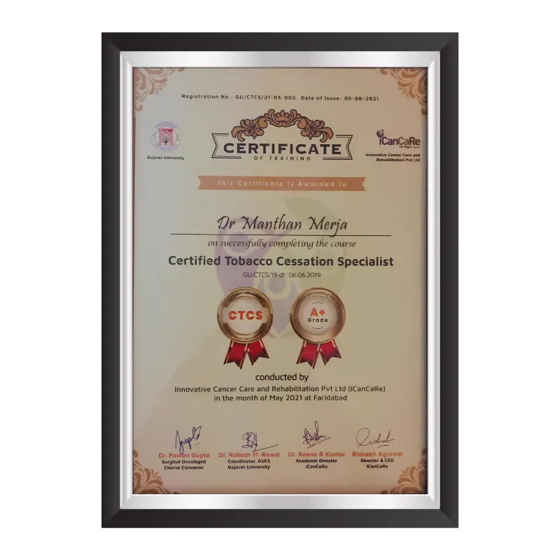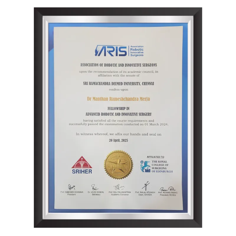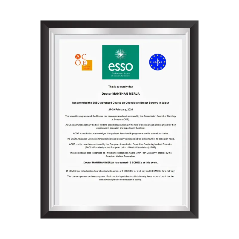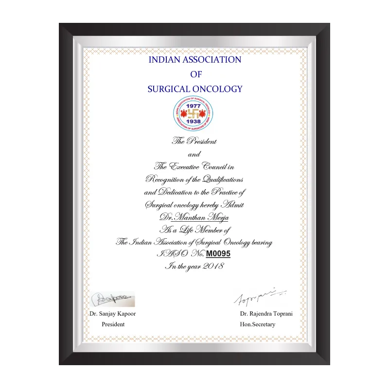 Dr. Manthan Merja has certifications that reflect his expertise, dedication, and excellence in surgical oncology. These prestigious recognitions highlight his academic achievements, advanced training, and commitment to delivering world-class cancer care. Each certificate is a testament to his professional journey and his mission to provide patients with the highest standards of treatment and compassion.