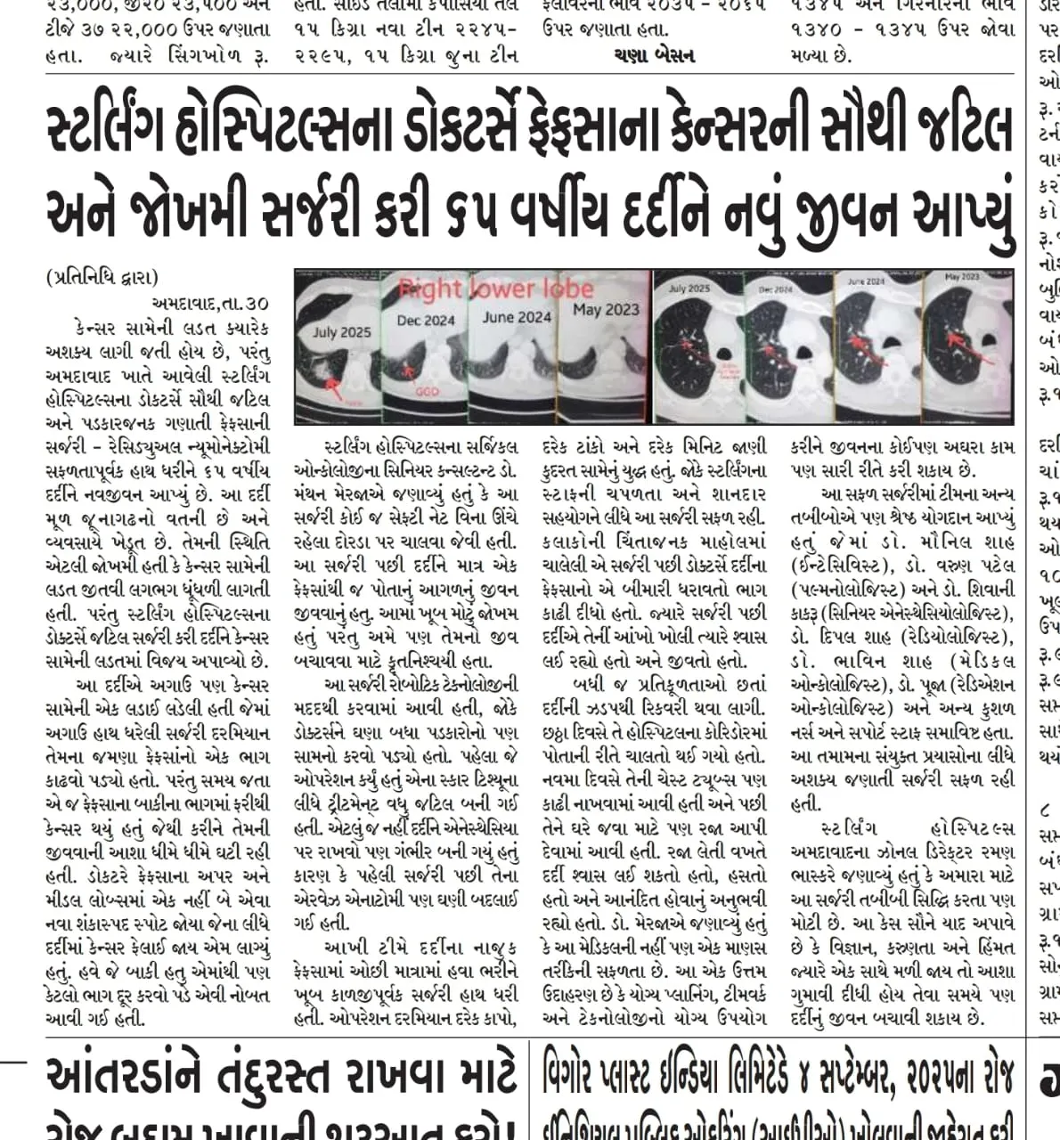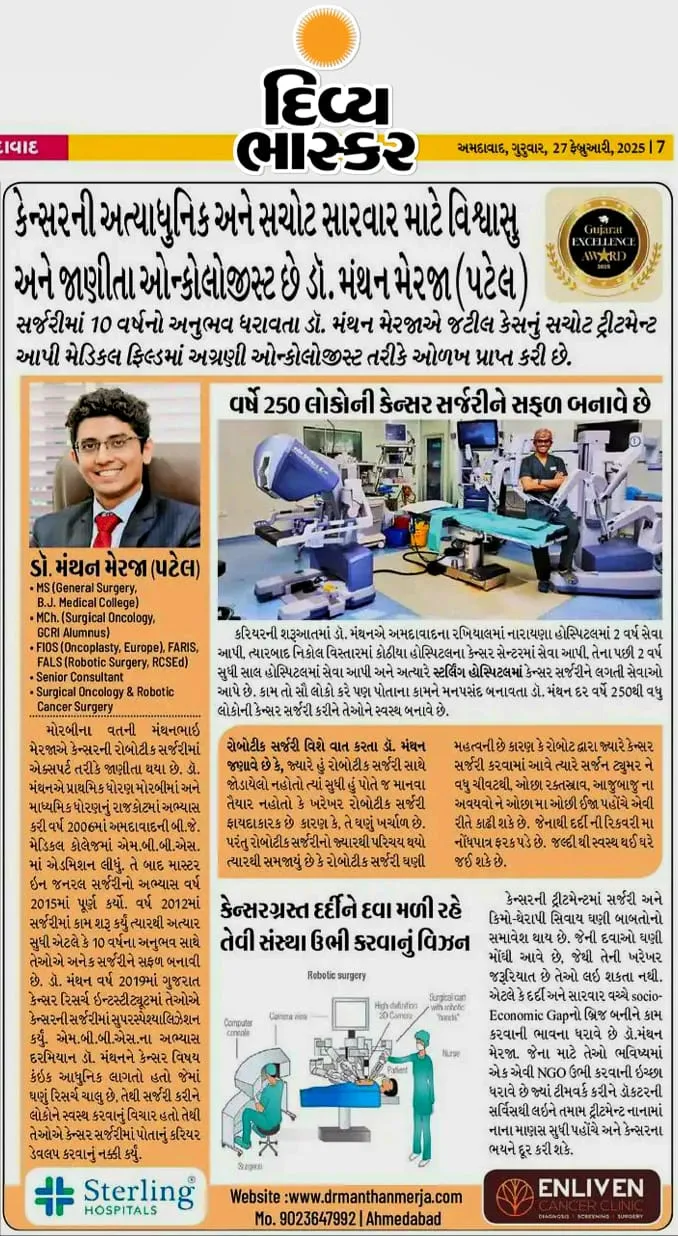Dr. Manthan Merja’s expertise and contributions in the field of surgical oncology have been featured across reputed newspapers, magazines, and media platforms. Through interviews, articles, and health awareness programs, he actively spreads knowledge about cancer prevention, early detection, and advanced treatment options. His presence in the media reflects not only his medical excellence but also his passion for educating the community and inspiring healthier lives.
